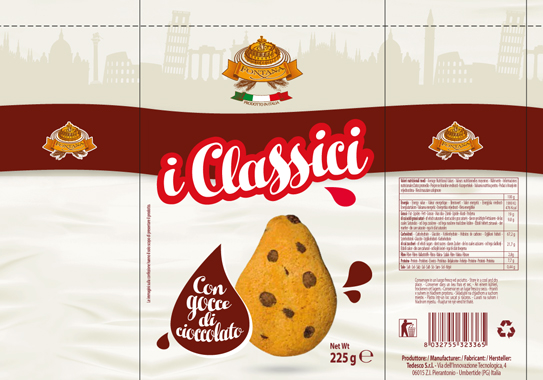 Chocolate chip biscuits manufacturing a drop cookie popular used in Italy and United States, features chocolate chips as its distinguishing ingredient. Our Italian traditional recipe combines a dough composed of butter and cocoa with semi-sweet chocolate chips. The Chocolate chips it becomes one of the Italy's most famous baked biscuits for traditional breakfast, and one of the best sellers of the "Fontana Biscuits" it's long shelf life is ideal for big food distribution market. |